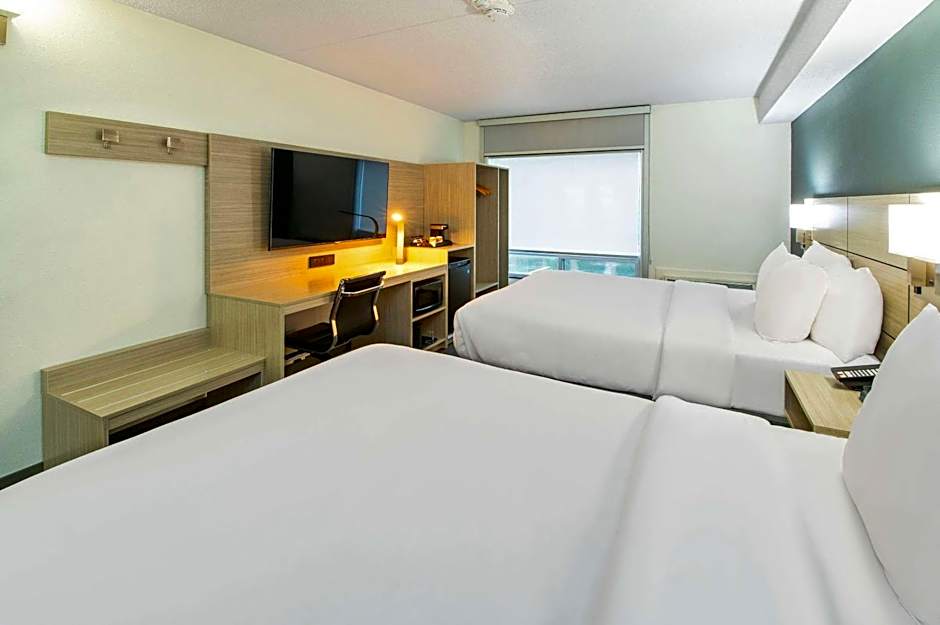 This room includes a 32" flat-screen TV, air conditioning, a fridge and a microwave.